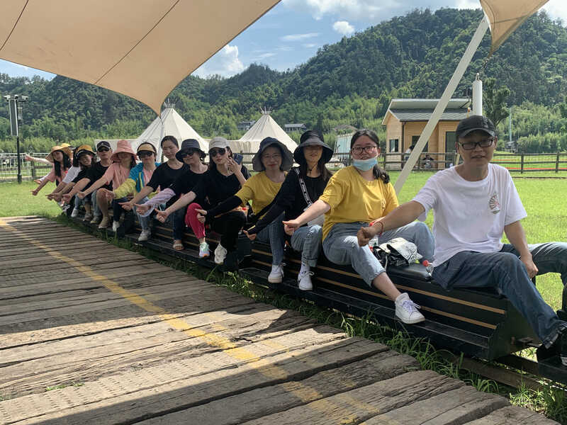 歷經三個半小時的車程,寧波、義烏兩地的小伙伴們終于勝利會師。短暫休整后,滿血復活的我們雄赳赳氣昂昂地奔赴風之谷戶外樂園。此時正值一天之中最熱的時辰,但縱使頂著這般艷陽,我們仍興致不減。爛熟于心的《天天向上》BGM一響起,大家便默契地隨著音樂跳起手勢舞來。接下來是自由活動時間,我們坐上小火車,伴著鳴笛聲徜徉花海,眺望遠山。駕駛著新西蘭卡丁車,感受快速俯沖的樂趣;去坡上滑草,穿梭于綠意田園之際;系緊救生衣,體驗水陸兩棲車的顛簸搖擺……若還覺著不夠驚險刺激,何不去彈簧飛人項目體驗一把失重的眩暈感?