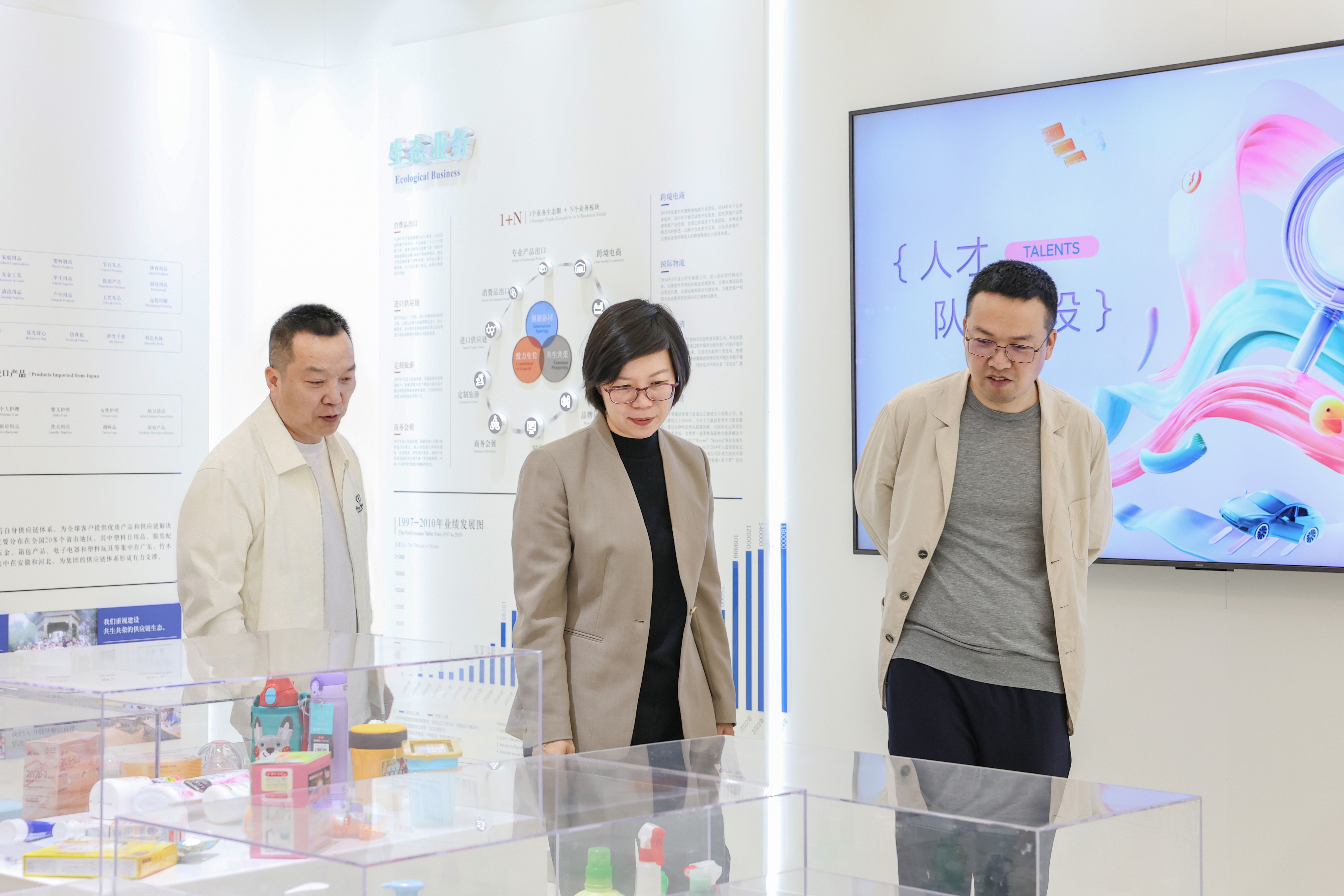 調研領導一行參觀了賽爾企業文化展廳,方保軍總經理介紹了集團在構建發展一般貿易、跨境電商、生態圈布局三條賽道中的運營情況。